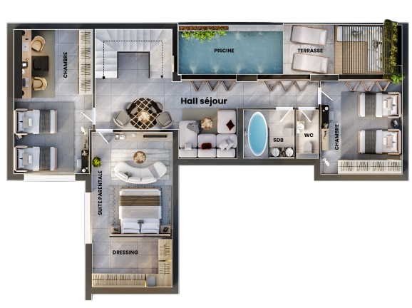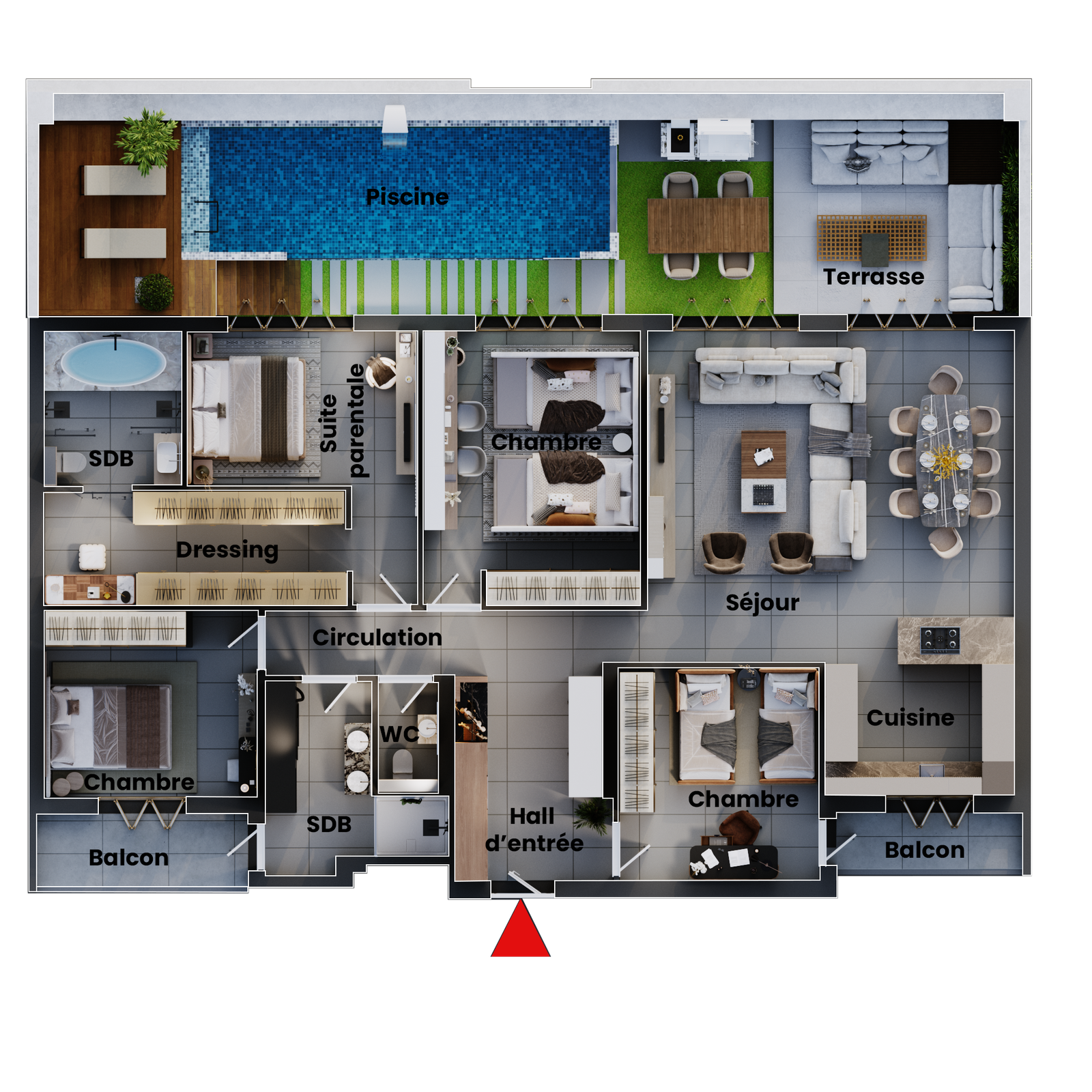 La Residence Galaxy propose égalment un ensemble de commodités pensées pour enrichir votre quotidien, piscine, aire de jeux pour enfants et zone de détente en plein air. Tout a été imaginé pour créer un environnement où il fait bon vivre, à la fois serein et conn-ecté aux commodités urbaines.